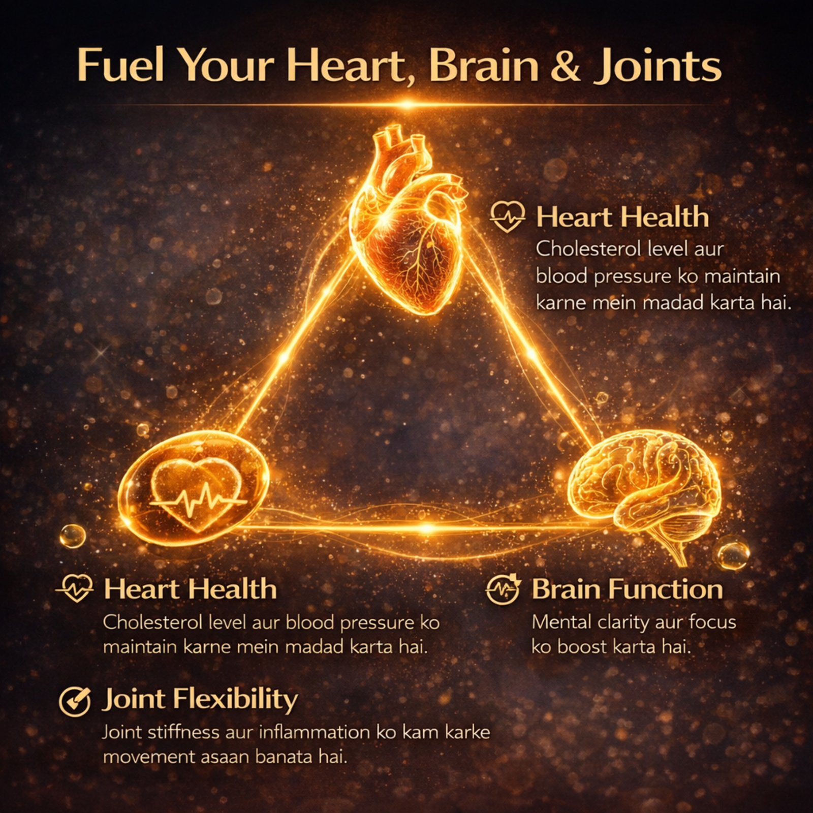 Omega-3 Fish Oil provides a concentrated source of essential fatty acids—EPA (Eicosapentaenoic Acid) and DHA (Docosahexaenoic Acid)—that your body needs for optimal performance. Regular intake supports heart health, brain and eye function, joint flexibility, and immune response. Sourced from pure, deep-sea fish and purified for safety, it’s a natural way to boost your overall well-being.